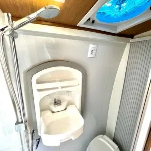 Banheiro completo com ducha aquecido a gás, claraboia com exaustor, lavabo, sanitário fixo, aquecedor de toalha;